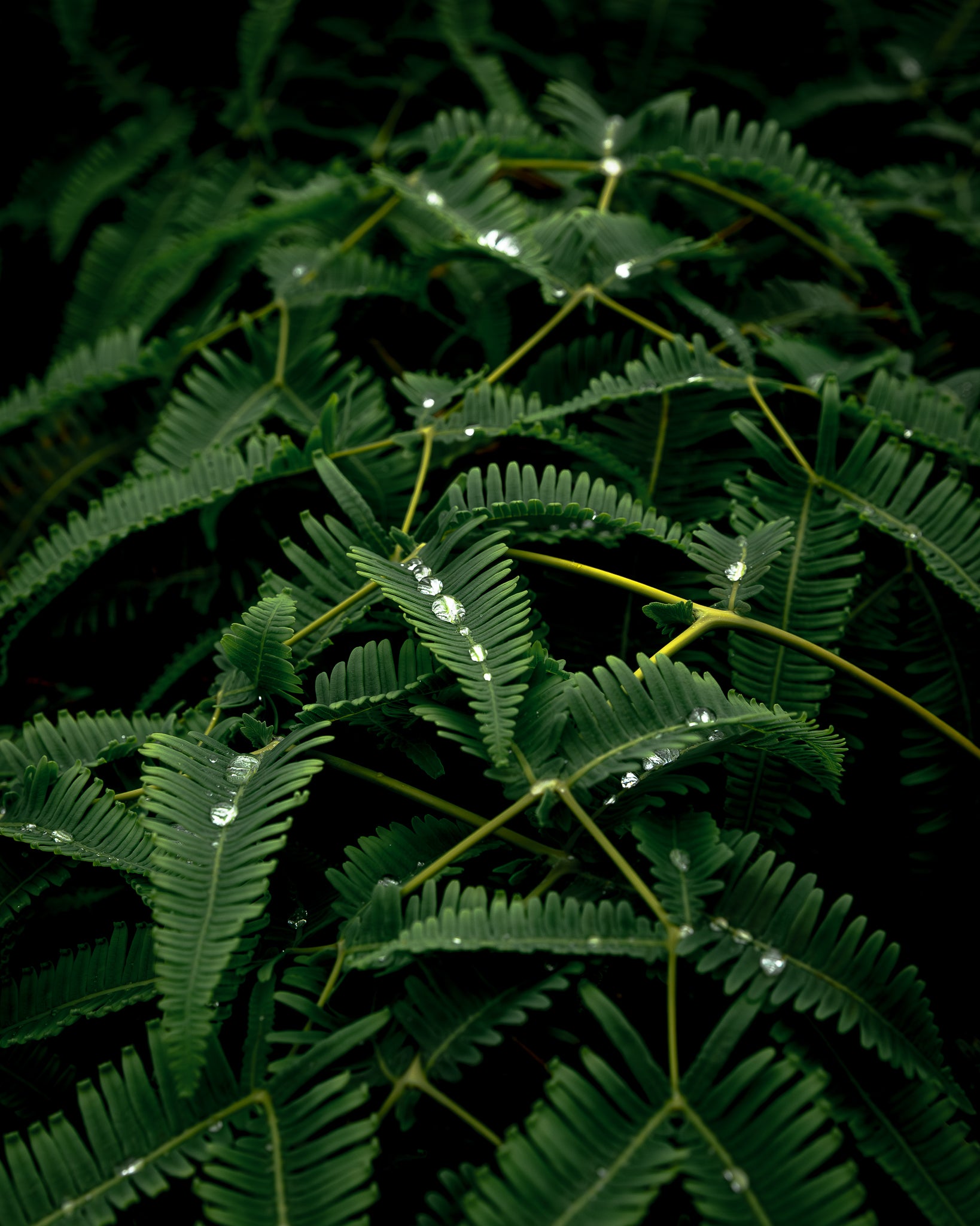 Raindrops on ferns along the Waihee Ridge Trail in Maui.